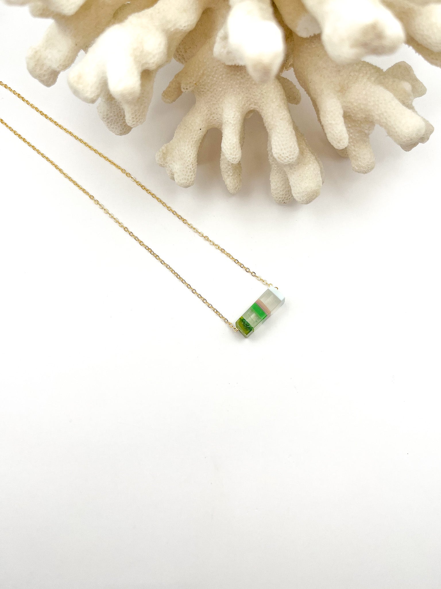 Bar bead is recycled surfboard resin. Chain is gold plated cable chain.