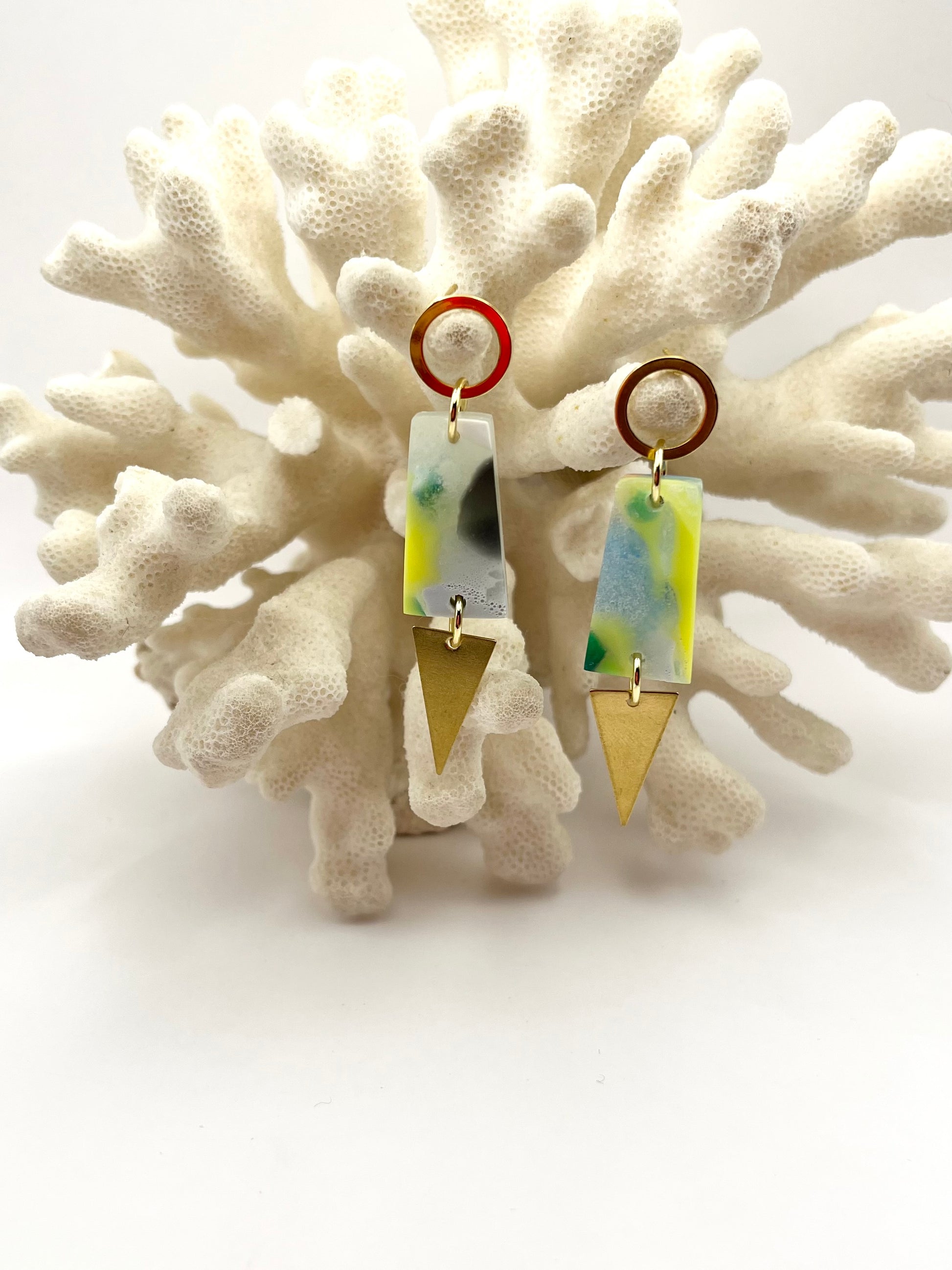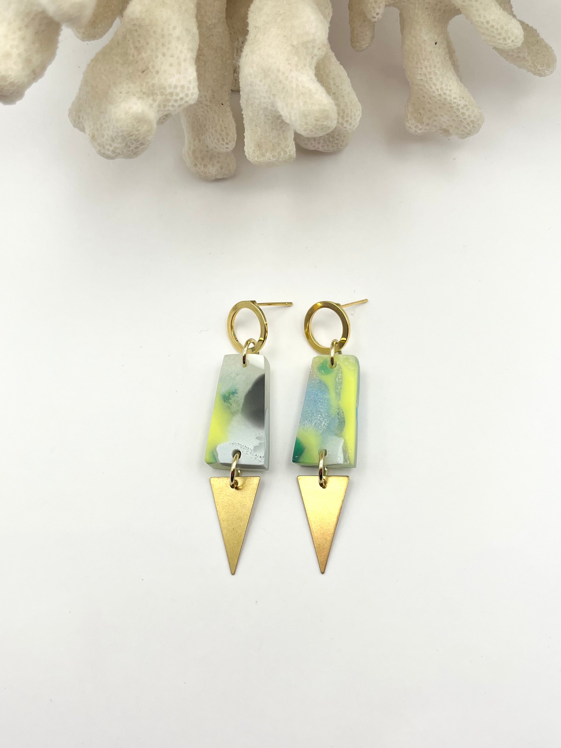 Geometric dangles with recycled surfboard resin, brass triangle charm, and gold plated ear post